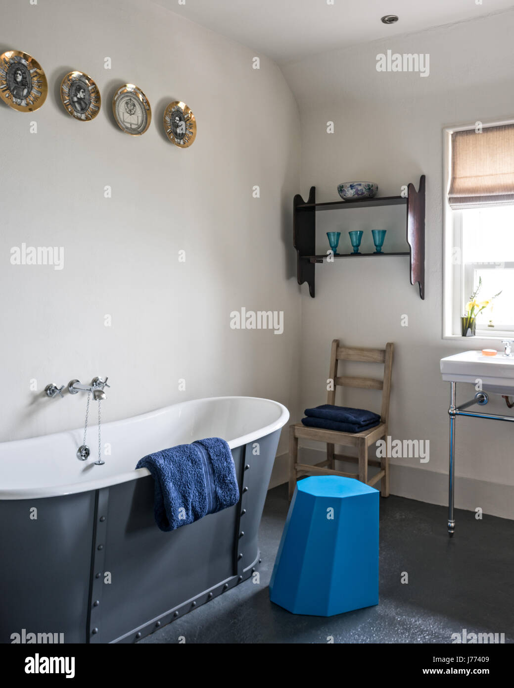 Dekorative Platten Oben Grau Freistehende Badewanne Im 17 Jahrhundert Steinhaus Bad Mit Hocker Von Martino Gamper Stockfotografie Alamy